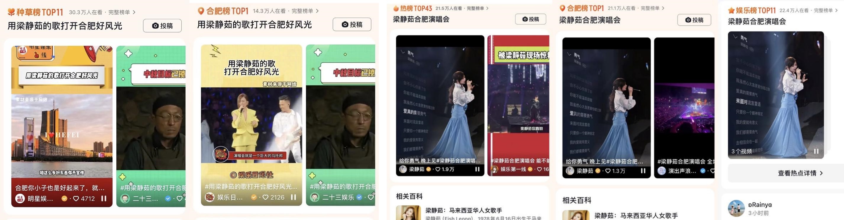 为助力此次演唱会触达更广泛的受众群体,抖音演出借势当地文旅及热门景点热度,邀请安徽文旅、合肥文旅与梁静茹发起视频共创,结合梁静茹的音乐影响力,在9月13日发起演唱会预热,打造#用梁静茹的歌打开合肥好风光 热点,推动话题霸屏安徽16个地级市的同城榜,最高位达合肥榜TOP1、种草榜TOP11,在榜时长近5天。此外,#梁静茹合肥演唱会 话题热度持续攀升,曝光量高达1445w+,凭借超高的话题关注度与广泛的歌迷投稿,荣登总榜TOP43、娱乐榜TOP11、合肥同城榜TOP1。