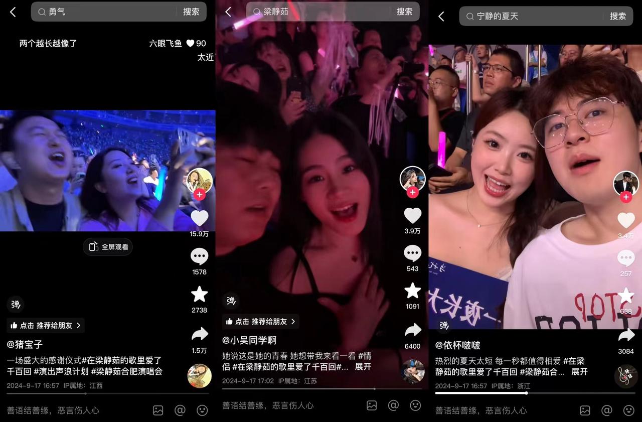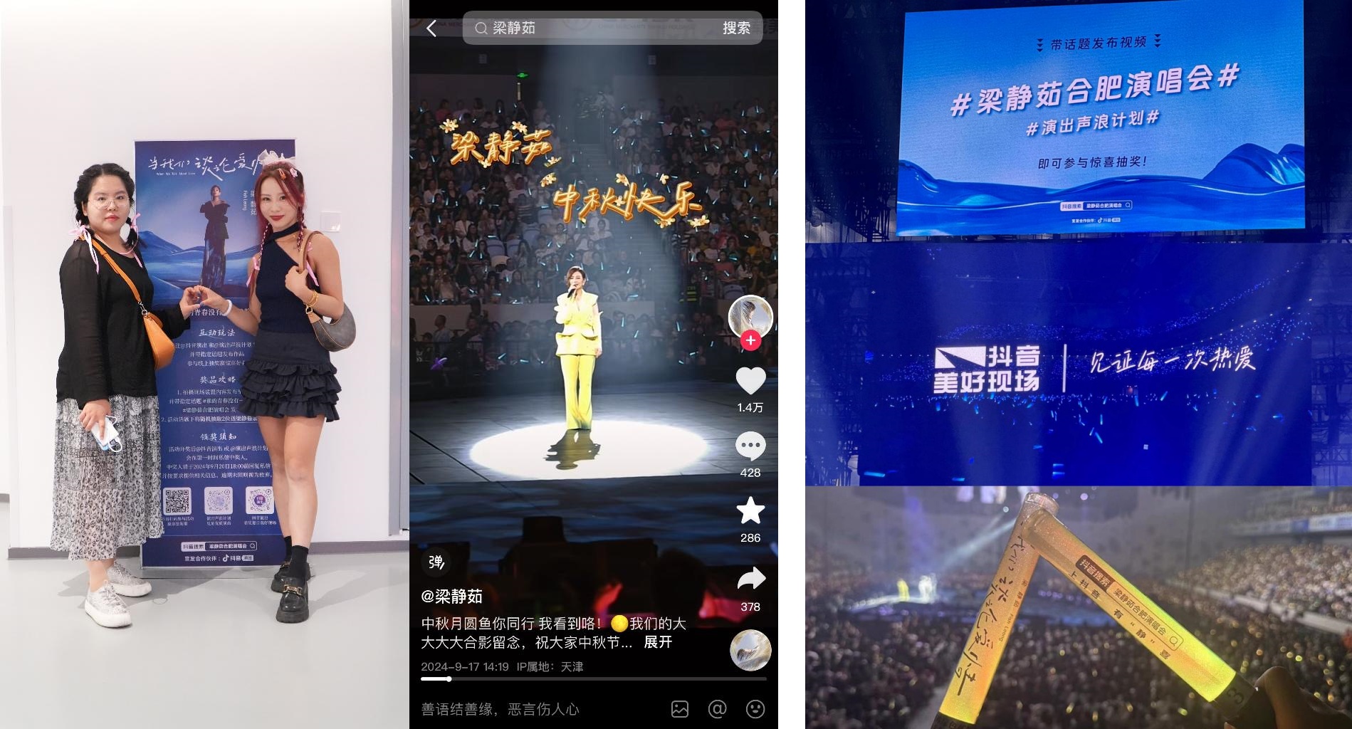 值得一提的是,合肥站恰逢中秋佳节及梁静茹出道25周年,抖音演出巧妙运用这一节点优势打造相关热点,引发众多歌迷用户围绕合肥站现场,积极自发开启内容分享,包括但不限于粉丝为梁静茹唱生日歌、梁静茹回馈的中秋祝福、独特的唱《天灯》环节,以及与粉丝的亲密合拍合唱等瞬间,线上线下齐庆祝,不仅展现了演唱会现场的热烈氛围和温馨互动,更深刻传达了梁静茹与粉丝之间深厚的情感纽带。